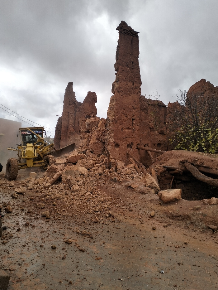 This image captures a demolition or clearing operation in Ouaouizert, Morocco, under an overcast sky