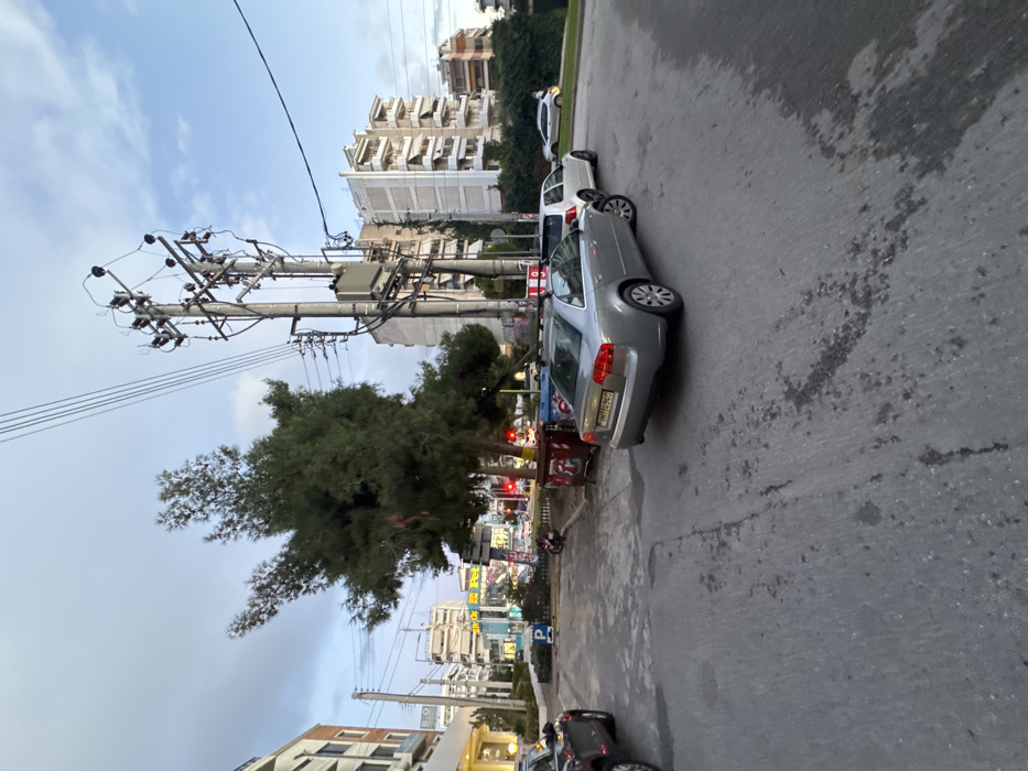 A street scene features parked cars alongside a sidewalk lined with trees and buildings. A utility pole heavily laden with wires and equipment stands prominently. In the distance, taller apartment buildings are visible against a cloudy sky. The road surface appears damp, and the angle of the photograph suggests it was taken from a slightly tilted perspective.