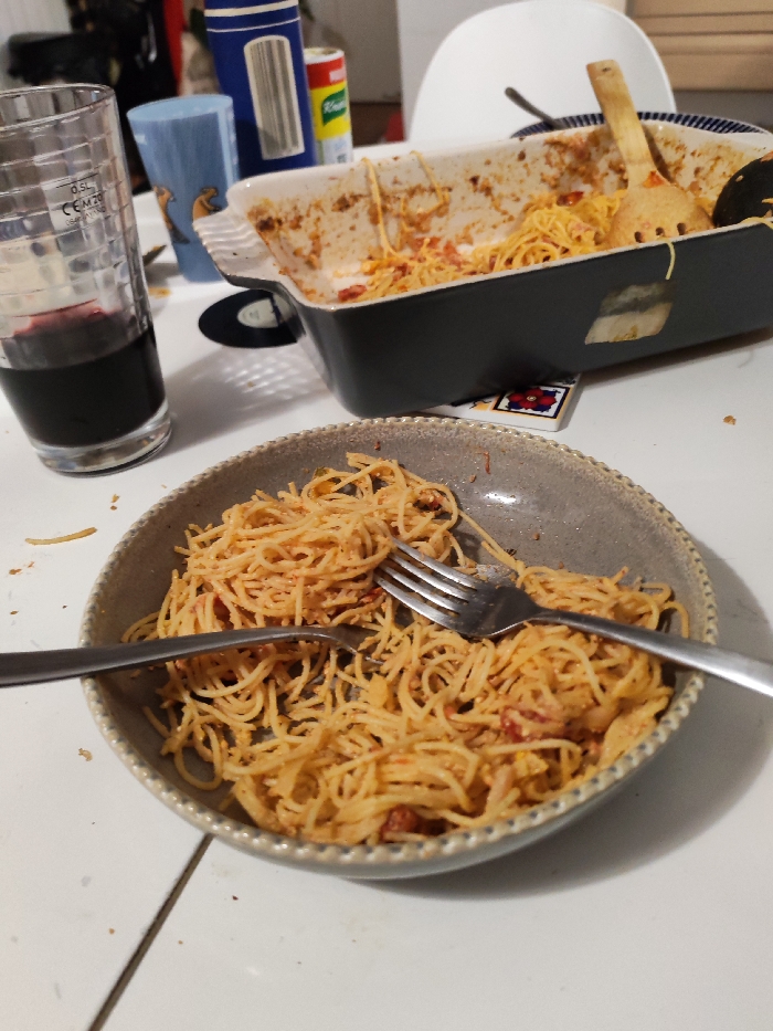 A bowl of spaghetti sits on a white surface, two forks tangled within the noodles. Adjacent, a partially eaten spaghetti casserole dish holds a wooden spoon and spatula. A glass of red wine stands nearby, along with a blue mug and various pantry items in the background. The scene suggests a casual, possibly post-meal setting.