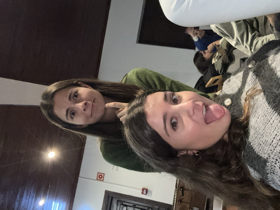 Two young women pose for a photo. One, in an olive green shirt, stands behind the other, touching her chin with a playful expression. The second woman sticks her tongue out, wearing a gray sweater with large buttons. In the blurry background, additional people sit at a table. The interior space features dark wood paneling and a white ceiling. A red fire alarm and doorway are visible in the background.