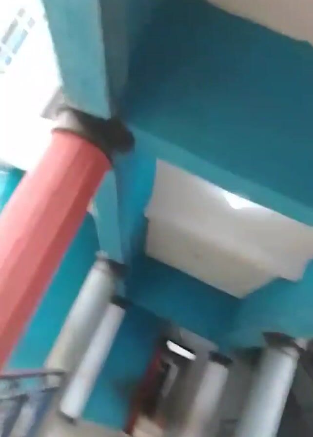 The camera is moving while capturing a building exterior with a blue and white color scheme. The building has a corridor with pillars and a railing. Children can be seen in the corridor. A red pillar is prominently featured in the foreground. The building appears to have multiple stories, with windows visible on the upper levels. The camera movement is shaky, indicating it is hand-held. The overall setting seems to be a school or similar institution.