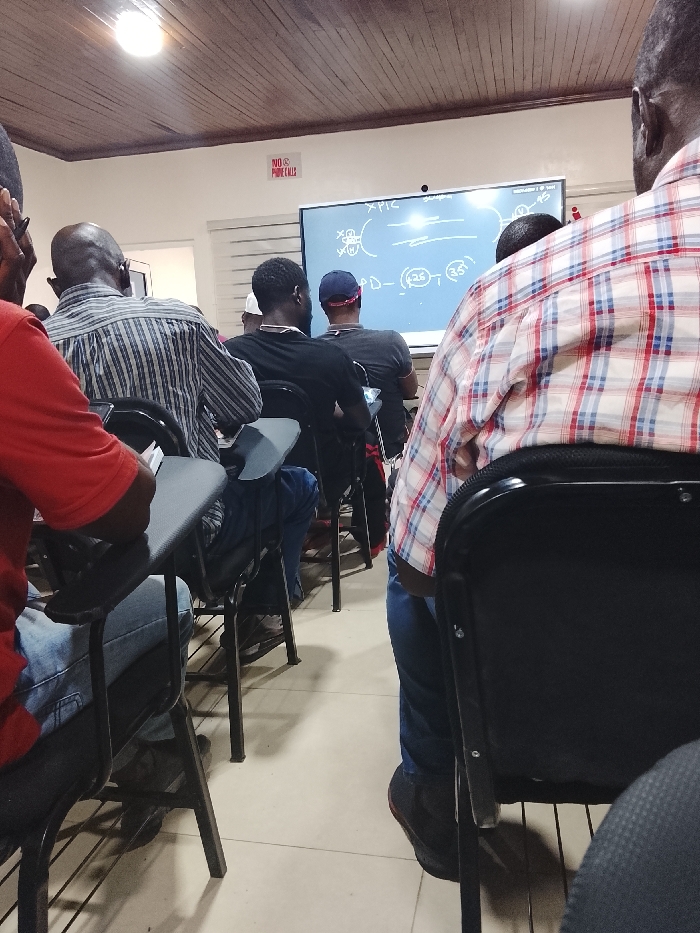 An indoor classroom or training room, located in Unknown, Unknown, is depicted from a rear-side perspective. Multiple adult males, predominantly dark-skinned, are seated in black chairs with attached writing tablets, facing a large wall-mounted display at the front of the room. The display shows technical or mathematical diagrams and text, including "XPIC" and "PD-(25)-(35)". A man in a red t-shirt and blue jeans is visible on the far left, using his writing tablet. Next to him, another man wears a striped grey and white shirt. Further back, a man in a black t-shirt and a blue baseball cap is seated. On the far right, a man in a red, white, and blue plaid shirt is partially visible. The room features white walls, a light-colored tiled floor, and a wooden paneled ceiling with overhead lighting fixtures. A red sign on the front wall reads "NO MOBILE CALLS". Attendees are passively observing the display.