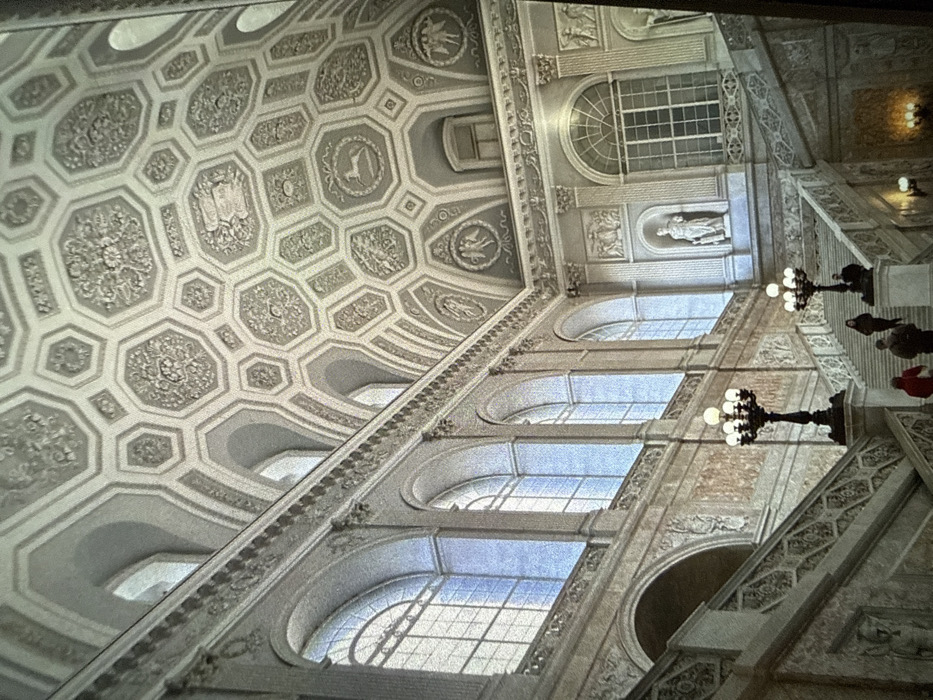 This image depicts a grand interior architectural space, located in the city of Senokos, Bulgaria. The scene is dominated by a majestic, bifurcated marble staircase with ornate balustrades featuring intricate geometric carvings. The walls are adorned with numerous tall, arched windows, each with multiple panes, extending through multiple levels and admitting significant natural light. The high ceiling is elaborately coffered, primarily with hexagonal and some rectangular panels, each containing detailed bas-reliefs depicting mythological figures, animals such as a deer, human forms, and botanical motifs. The architectural style includes pilasters, decorative friezes, and cornices. On the upper levels, several niches are visible within the wall structure; one prominently displays a white classical statue of a standing male figure. The staircase is illuminated by two large, black, multi-armed lampposts, each with multiple globe lights, positioned on the balustrades at a lower landing. Several individuals are present on the staircase. In the foreground on the left, one person wears a red top, and another wears a dark jacket, both ascending. Further up the left branch of the staircase, an individual in a dark coat stands. On the right branch, another person in a dark coat is visible near a lamppost, also appearing to ascend.