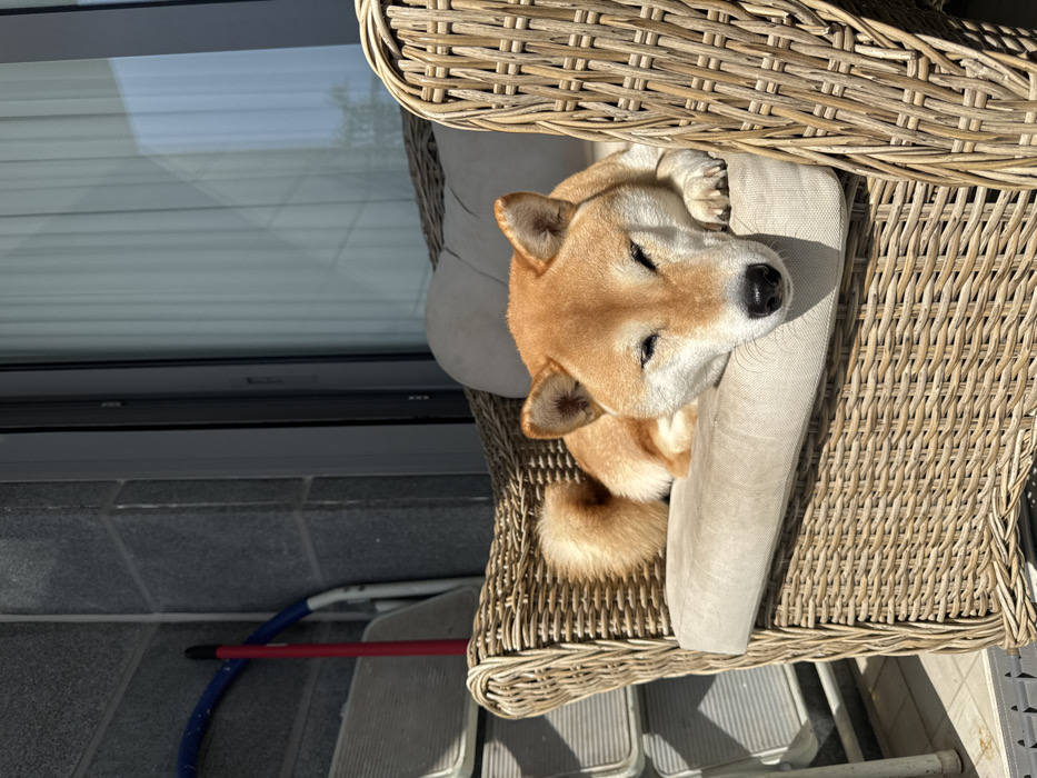 - "A Shiba Inu dog is depicted resting on a light beige cushion within a light brown woven wicker armchair" by FM-Eqgh52, licensed under CC BY 4.0