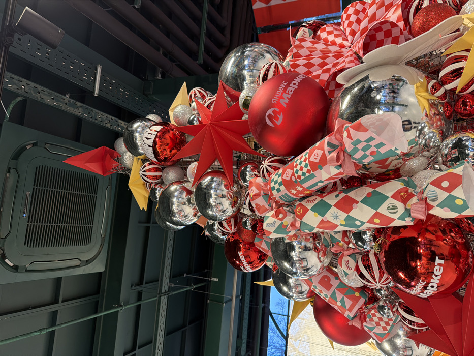 A low-angle, detailed shot captures a large, festive holiday decoration, likely an abstract Christmas tree, densely adorned in red, silver, and white, within an indoor commercial setting in Moscow, Russia, specifically identifiable as a Yandex Market location