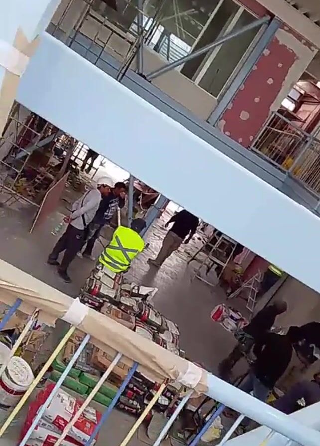 view from a balcony or elevated platform overlooking an active construction site inside a building. Several construction workers are visible, some wearing safety vests, moving around on the ground floor. There are bags of construction materials piled up near the balcony railing. The building appears to be in the process of being built or renovated, with exposed metal framework, unfinished walls, and construction equipment visible. The lighting is bright, suggesting an indoor environment. The camera moves slightly.
