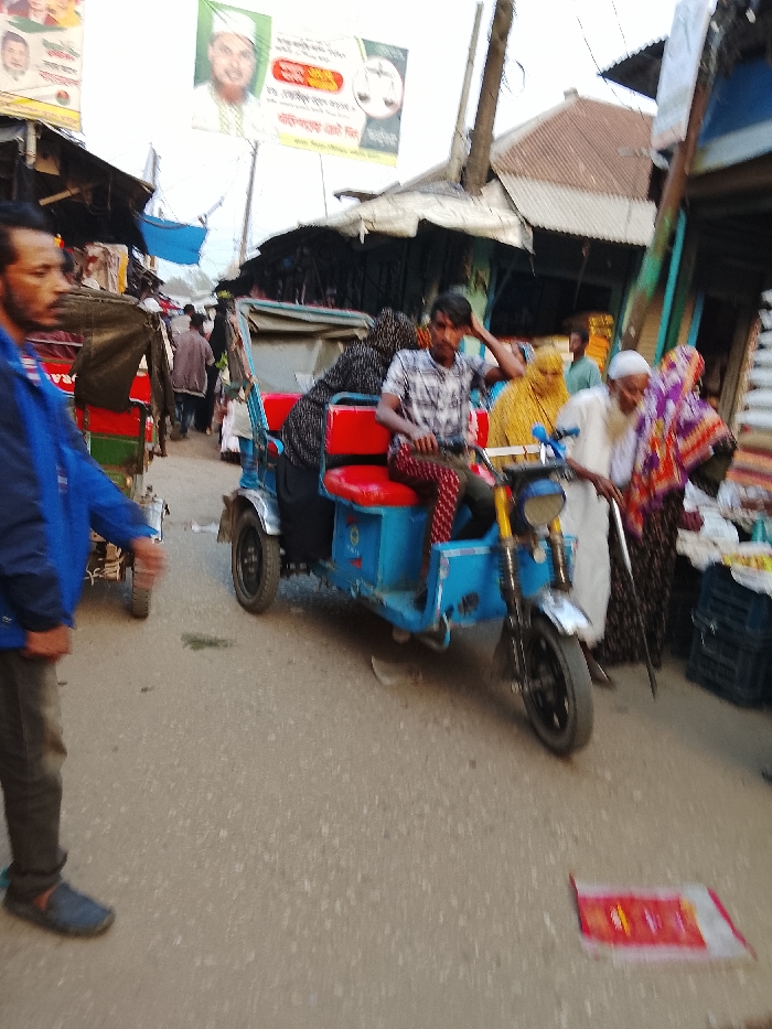 The image displays a bustling street scene in Shibpur, Bangladesh, characterized by active pedestrian and vehicle traffic. A paved road occupies the central and lower portions of the frame. In the immediate foreground on the left, a man is partially visible, wearing a blue jacket and dark pants, with his right hand extended forward. In the midground, a light blue three-wheeled electric auto-rickshaw with prominent red padded seating is stationary on the road. A young man, wearing a plaid shirt and red patterned trousers, sits in the driver's seat, with his right arm bent and hand touching his head. Behind him, a woman dressed in dark clothing is seated as a passenger. To the right of the auto-rickshaw, an elderly man with a white beard, clad in a white tunic, stands supported by a wooden walking stick. Adjacent to him, a woman wearing a yellow head covering and another woman in a multi-colored patterned garment are partially visible. Further into the midground and background, multiple individuals are visible walking along the street, suggesting a market or commercial area. Another auto-rickshaw, green and red, is partially visible on the left side of the road in the midground. The street is lined with buildings and market stalls featuring corrugated iron roofs and makeshift shelters constructed with tarpaulins. Overhead, utility poles and a network of electrical wires are present. Large banners displaying faces and text in Bengali, likely advertisements or political posters, are suspended above the street. A small, rectangular red and white object lies on the pavement in the lower right quadrant of the image.