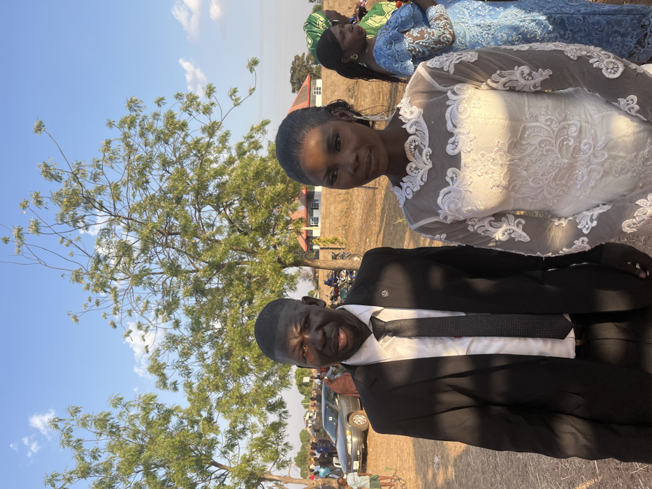 The scene depicts an outdoor daytime gathering in the city of Unknown, Nigeria. In the foreground, a male subject stands on the left, wearing a black suit, white collared shirt, and a dark, patterned tie with a small emblem on his left lapel. He has short dark hair and a neutral expression, looking directly forward with a slightly open mouth. To his right, a female subject wears a long-sleeved white gown featuring elaborate lace overlays on the bodice and sleeves. She has dark hair pulled back and is adorned with long, dangling silver earrings, her gaze directed slightly to the viewer's right. In the mid-ground, a third female in a light blue lace dress and green headwrap is partially visible on the right. The background includes a gathering of multiple individuals, including children, on the left. A silver sedan and a partially visible motorcycle are parked behind them. Further back, a structure with a reddish-brown roof and white walls is present on the right. The environment features dry, reddish-brown earth, numerous trees with green leaves, and a clear blue sky with scattered white clouds. The scene is lit by natural sunlight, casting visible shadows.
