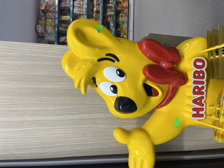 This image captures an interior view of a retail establishment located in Silistra, Bulgaria. The primary subject is a large, yellow, glossy plastic merchandising display shaped as the Haribo Goldbear mascot. The mascot is depicted with an open mouth, white eyes with black pupils, stylized black eyebrows, and a prominent red bow tie. Its left arm is raised, and a green price sticker displaying '2.50' is attached to its left shoulder. The brand name 'HARIBO' is rendered in red capital letters on the display's lower chest, directly above a compartment holding small, yellow-packaged Haribo products. The immediate background to the left features a vertical light-colored wooden panel. To the right, multiple retail shelves, painted light blue, are visible, densely stocked with various packaged snack items. The flooring is a light grey. No persons are present.