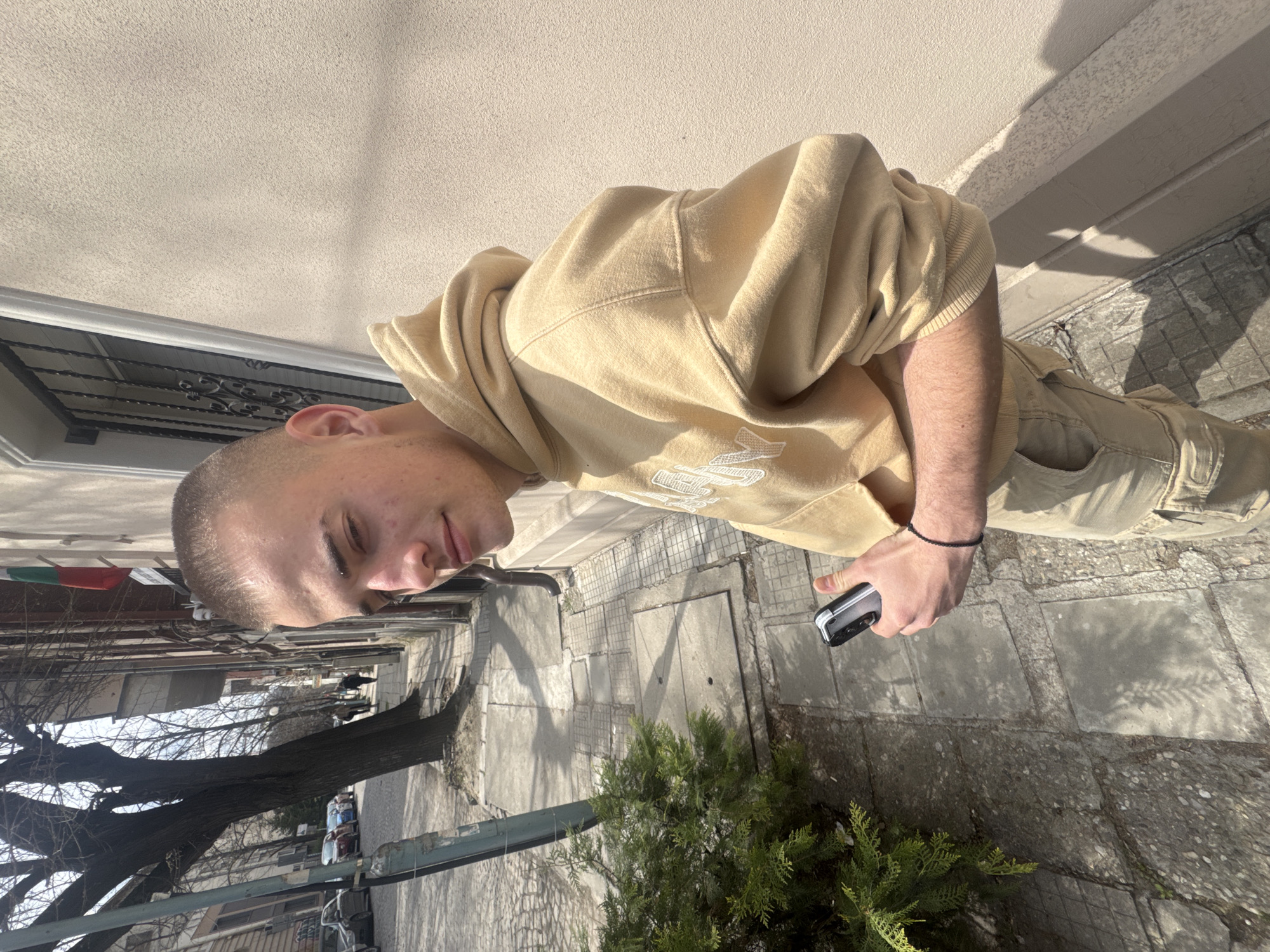 The image displays a young adult male positioned on an irregularly tiled concrete sidewalk in an urban setting identified as Plovdiv, Bulgaria. The male, with a buzz-cut hairstyle, a small stud piercing above his left eyebrow, and minor facial blemishes, is angled slightly to the viewer's right, with his head turned to face the camera directly. He exhibits a relaxed expression, with slightly squinted eyes. He is wearing a light tan hooded sweatshirt featuring white embroidered text, partially visible, across the chest, and matching light tan cargo pants. A black beaded bracelet is visible on his right wrist. He holds a silver-colored flip phone in his right hand, with his thumb resting on its surface. To the subject's immediate left, a dense green coniferous shrub is present. The background consists of a light beige, textured building wall, brightly illuminated by direct sunlight, which casts sharp shadows from the subject and architectural features. A window with dark, decorative metal grilles and a vertically oriented Bulgarian flag (white, green, red stripes from top to bottom) are visible on the building's facade. The sidewalk extends into a paved street, where several parked vehicles are visible in the distance. The street is also lined with several tall, bare deciduous trees, casting prominent shadows across the pavement. The scene is illuminated by bright, clear daylight, suggesting a mid-day setting during a season when trees are bare.