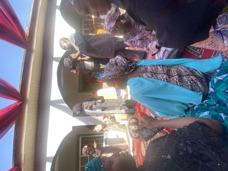 The scene depicts an outdoor gathering in Kwarbai A, Nigeria, set within a courtyard featuring a white building with arched entryways