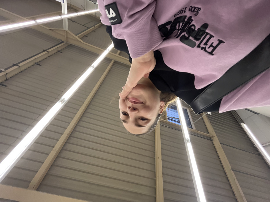 A young female is depicted from a low-angle, looking towards the camera with a subtle smile. Her left hand is raised, gently touching her cheek. She is wearing a two-toned hooded sweatshirt, with the upper portion in black and the lower portion in light purple. A black rectangular patch with white 'FILA SINCE 1911' text is present on the left sleeve. On the purple chest area, black embroidered text reads 'Filastyle since 1970'. A black strap, consistent with a shoulder bag, crosses her body. The background features a corrugated metal ceiling with visible wooden support beams and multiple illuminated linear fluorescent light fixtures. A small rectangular skylight is visible in the upper right portion of the image. The scene is located in Lampertheim, France.