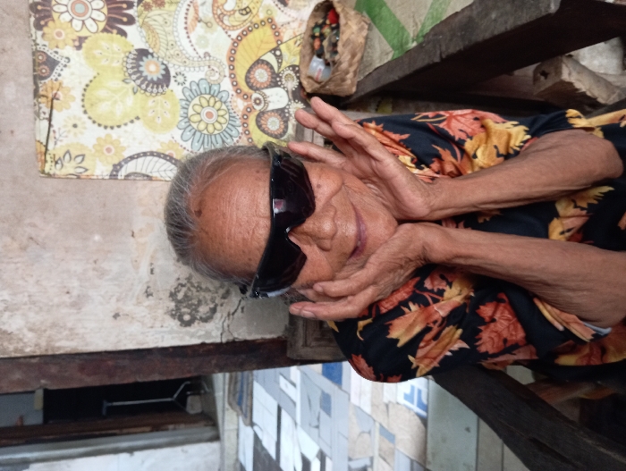 An elderly individual with gray hair and dark sunglasses sits at a table, resting their face in their hands. They wear a black and orange floral shirt. The table is covered with a patterned tablecloth. Behind the person, there's a glimpse of the interior, showing a tiled wall and wooden elements. A small basket sits on a shelf in the background.