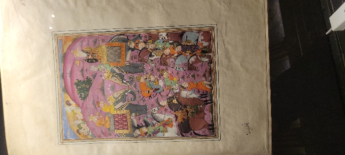 An antique painting features a royal procession dominated by pink hues