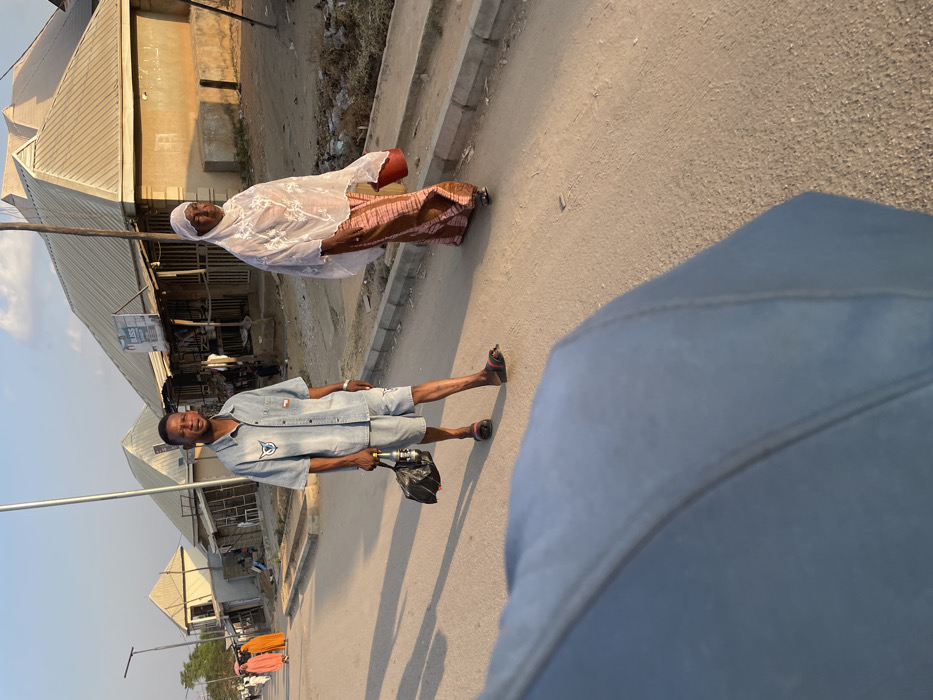 The scene depicts a street in Ajaokuta, Nigeria, under clear, bright skies with sunlight casting elongated shadows from left to right across the paved roadway
