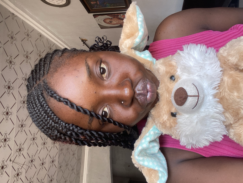 The scene depicts an interior room in Rido, Nigeria. A young adult individual with dark skin and black braided hair is centered in the frame, wearing a magenta ribbed tank top. A small silver stud is present in their left nostril. The individual's lips are pursed into a pout, cheeks are slightly puffed, and eyes are directed towards the viewer. They are holding a plush, light brown and white rabbit-like stuffed animal against their chest. The stuffed animal has dark eyes, an embroidered brown nose and mouth, and light blue polka-dotted inner ears. The background consists of a light-colored wall with visible decor including a circular analog clock and two framed artworks, one of which depicts a portrait. The white ceiling displays a repeating pattern of dark geometric lines and ornate designs.