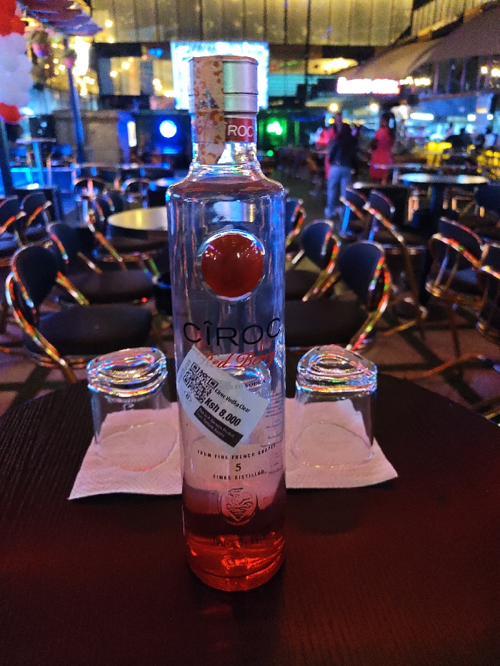 A bottle of Ciroc Red Berry vodka sits on a dark wooden table between two upside-down glasses on white napkins. The bottle is labeled with the name of the vodka and a QR code. In the background, there are multiple tables and chairs, some occupied by people, set up on an outdoor patio with colorful lights.