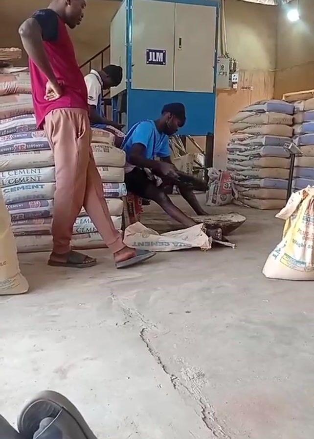 three people in a large warehouse-type building with a corrugated metal roof. Stacks of large cement bags are visible along the walls. One man, wearing a red shirt and light-colored pants, stands near a stack of bags, his hand on his hip. Another man, wearing a blue shirt, sits on a bag and appears to be sewing or working on a bag on the floor. A third person, wearing a white shirt, is seated on bags. In the background, there is a large blue metal cabinet with "JLM" on it, along with electrical boxes on the wall. The floor is concrete with cracks. Additional bags of cement are on the floor. The overall impression is an industrial setting where goods are being processed or repackaged. The video appears to be taken by someone standing inside the warehouse near the floor.