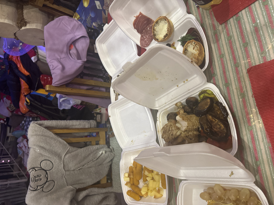 Stacked open takeout containers display various foods. One container holds sliced meats and filled pastry shells. Another contains roasted vegetables and pieces of fish. A separate container presents cubed apples and chicken strips. Grapes are in the final container. These sit on a striped surface. To the side is a purple face mask and a Mickey Mouse robe draped on a chair. Other assorted items fill the background.