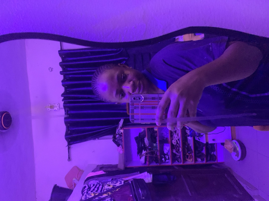 A person is taking a selfie in a mirror. The room is bathed in purple light. Dark curtains are behind the person, and a shelf filled with objects is visible. Cluttered items are at the bottom of the mirror's reflection. The phone held by the individual features a striped case. The person wears a dark top with a possible blue collar.