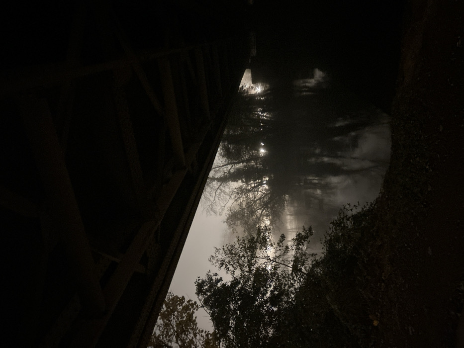 - "A low-angle shot reveals a body of water shrouded in dense fog, reflecting bare trees and a faint light source" by FM-ZvYlO2, licensed under CC BY 4.0