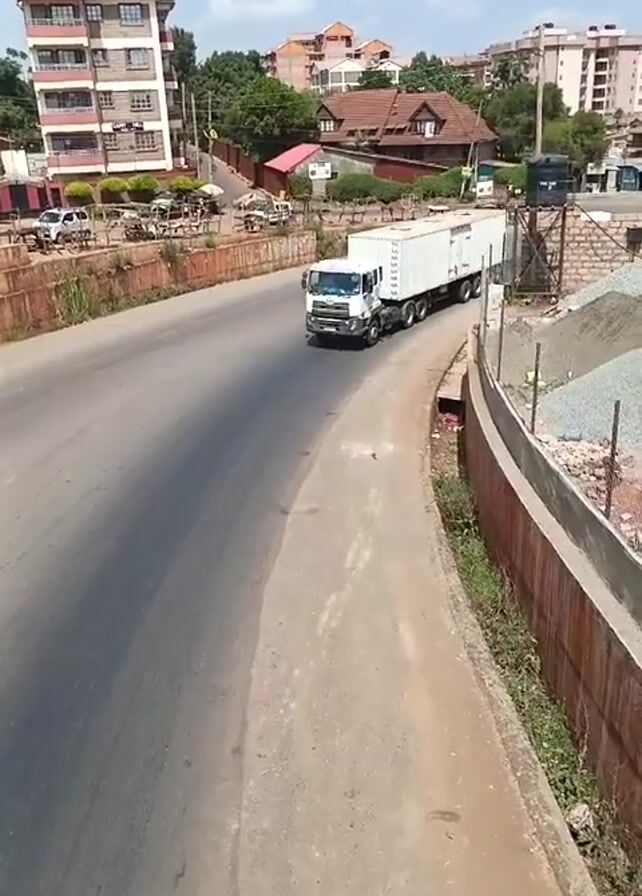 A wide shot shows a truck traveling on a paved road. The truck is white and has a single trailer. The road has a barrier on the right side and a lower divider on the left. In the background, there are buildings, trees, and a cloudy sky. The truck approaches the viewer, who is positioned on an overpass. Another white vehicle follows the truck at a distance. There are construction materials visible on the right side of the road.