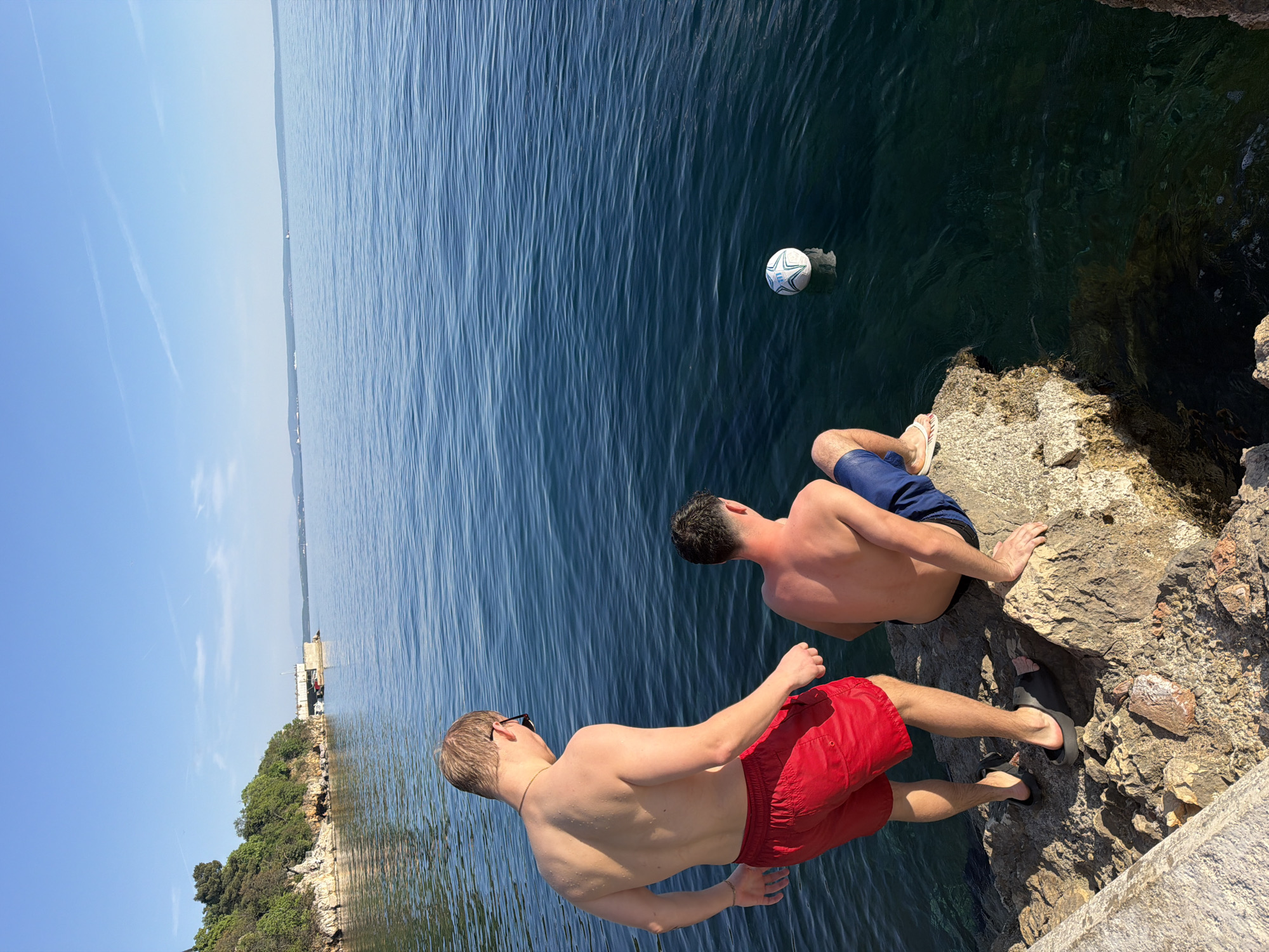 two shirtless men on a rocky outcrop overlooking a body of water. One man, wearing red shorts and sunglasses, is standing near the edge. The other man is seated on the rocks, wearing blue swim trunks and white flip-flops. A white soccer ball floats in the water below. The scene is set against a backdrop of a clear blue sky and a coastline with green vegetation and a small building structure visible in the distance. The location is Grad Rijeka, Croatia.