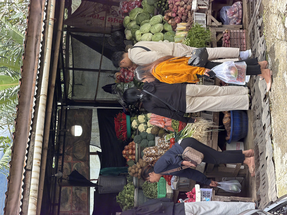 Four people are at an outdoor market. The stalls are piled high with produce, including cabbage, peppers, onions, and other vegetables. The people are bending over the produce, seemingly choosing items to purchase. The market stall is rustic with a corrugated metal roof and wooden framing. The ground is paved. One person is holding a plastic bag.