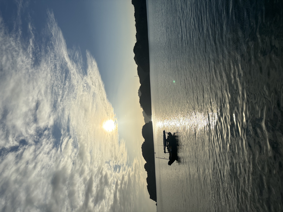 The image displays a serene maritime landscape at either sunrise or sunset over the waters of Cat Ba Island, part of Hải Phòng city, Vietnam. The sun, a brilliant, clear orb, is positioned in the upper-left quadrant of the frame, casting a strong golden reflection across the tranquil water. A textured canopy of white and grey stratocumulus clouds extends from the left, partially obscuring the sun, and transitions into a clear, deep blue sky towards the upper right. Directly beneath the sun, its intense light creates a shimmering vertical column on the water's surface. A single, dark-hulled boat, consistent with a fishing or small passenger vessel featuring a covered canopy, is silhouetted in the mid-ground, slightly to the left of the sun's reflection. No individuals are visible on the boat. The background is dominated by a chain of dark, rugged limestone karsts, forming a jagged horizon against the illuminated sky, with subtle hints of anthropogenic structures, possibly communication towers, discernible on some peaks. The water surface exhibits gentle ripples, particularly in the foreground.