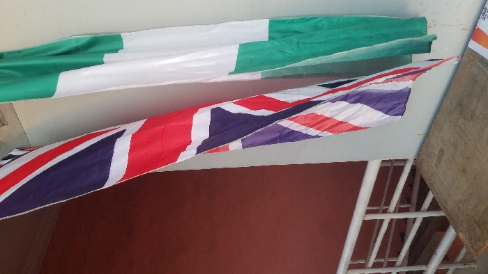 The image captures two national flags hanging vertically against a light-colored wall in Jos, Nigeria