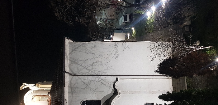 A white-walled building stands illuminated, its stark facade contrasted by the dark night. Shadows of bare branches dance across the wall's surface. Beyond the building, lights dot a pathway lined with trees and greenery. A vehicle is parked nearby. The scene is captured from an elevated perspective, showcasing the interplay of light and shadow.