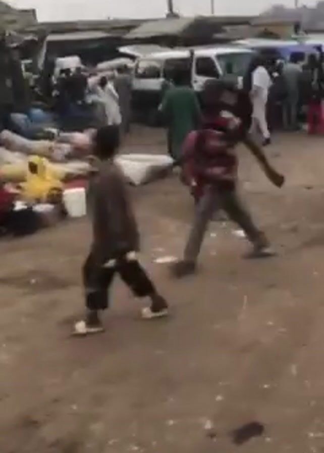 bustling outdoor market or gathering place. People are milling about, some sitting near large sacks or bags, others standing or walking around. Vehicles, including a motorcycle and vans, are visible in the background. One woman is shown bending over and sweeping the ground with a broom. The ground appears to be dirt or gravel, and the overall atmosphere suggests a busy, potentially crowded environment.