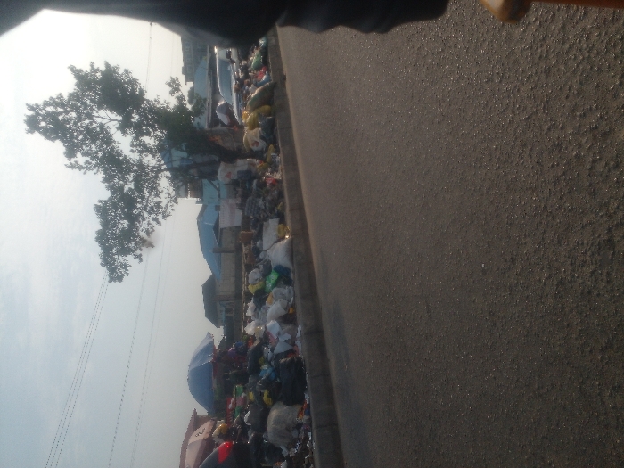 A street scene shows a large pile of trash lining the road. The refuse includes bags, discarded items, and general waste. Buildings are visible in the background, along with a tree. The adjacent road surface appears to be paved. The image suggests an issue with waste management in an urban or suburban environment.
