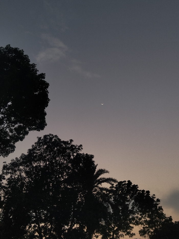 The image displays a twilight or pre-dawn sky over Dhaka, Bangladesh. The sky transitions from a deep gray-blue at the upper left to a pale orange-pink near the lower right horizon. A faint, white crescent moon is visible in the upper-middle portion of the sky, slightly to the left of the central vertical axis. Wispy, light gray clouds are present in the darker upper-left quadrant. The lower half and left side of the frame are dominated by the dark silhouettes of dense tree canopies. A large, multi-branched tree occupies the left edge, extending towards the center. Another substantial tree canopy is visible in the lower-middle, with a distinct palm tree silhouette featuring discernible fronds situated to its right. Additional tree outlines are present along the lower right edge against the lighter sky. There are no human subjects, man-made structures, or specific actions or interactions visible.