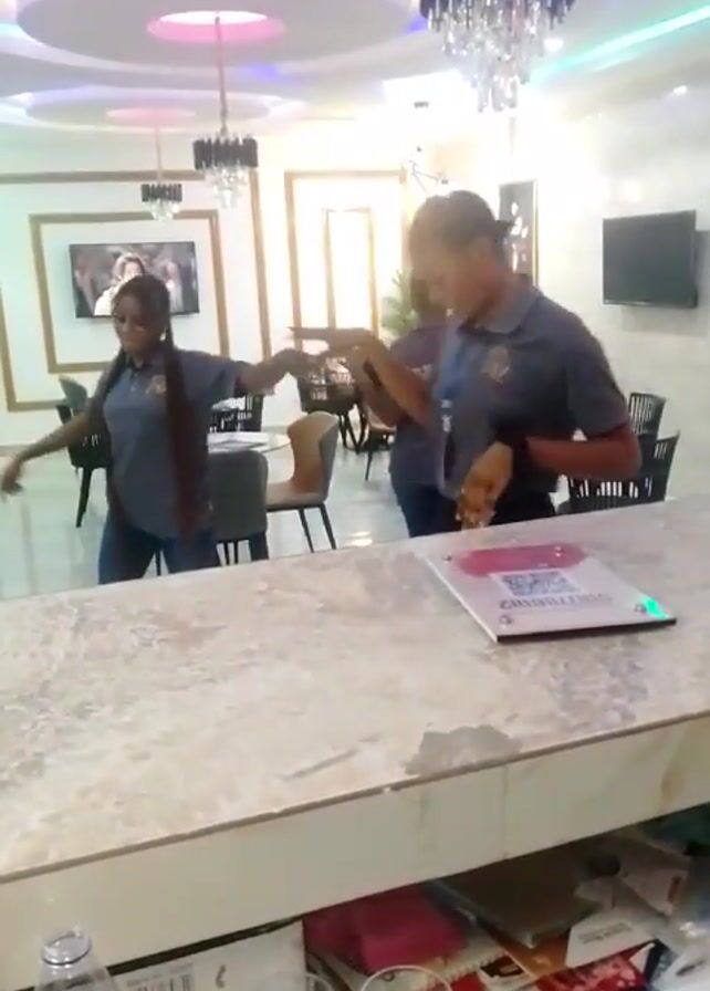 Three young women are dancing in a restaurant. They are wearing gray t-shirts and jeans and appear to be employees. The restaurant has several tables and chairs, chandeliers, and artwork on the walls. The camera is positioned behind a marble countertop, providing a view of the dancing women. There is a bottle of water and a couple of glasses on the counter in front of the camera.