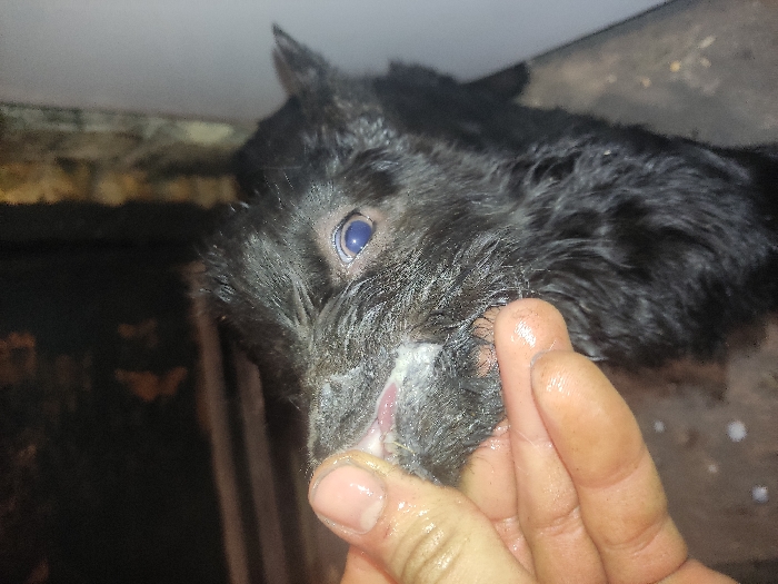 A close-up shows a black rabbit being held. Its head is tilted towards the camera, and its eye appears blue. The rabbit’s mouth and fur around its nose are wet and stained with white residue. A human hand grips the rabbit’s lower jaw, its fingers appearing shiny. The background is partially visible and includes what appears to be a wooden surface and a dimly lit interior.