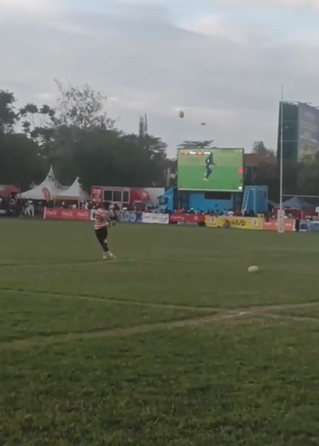 rugby match being played on a grassy field. A player in a red and white striped jersey and black shorts is seen kicking a rugby ball towards the goalposts. There is a large screen in the background showing a replay of the game. Tents and trucks with Coca-Cola branding are visible along the side of the field, indicating sponsorship. People are gathered around the perimeter of the field, observing the game. The sky is overcast.