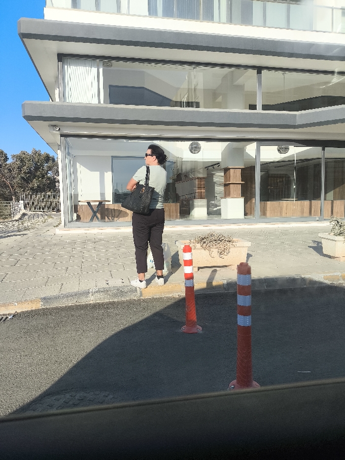 A single individual, appearing to be an adult female, stands on a paved sidewalk in Gonyeli, Northern Cyprus / Cyprus. She is positioned with her back partially to the camera, looking towards the left side of the frame, and wears a light-colored short-sleeved top, dark trousers, and white sneakers. A dark, possibly textured, handbag with a gold-toned circular accent hangs from her left shoulder, and she wears dark sunglasses. The individual stands in front of a modern, multi-story building characterized by a clean, minimalist design with a flat roof and prominent dark gray horizontal bands separating white sections. The building features extensive glass facades on both the ground and upper levels. Through the ground-floor windows, interior elements are visible, including a table with an X-shaped base, wooden display units, and circular wall decor. The upper floors also incorporate glass railings. To the left of the building, beyond a metal fence, is an area with trees and natural vegetation. The immediate foreground consists of an asphalt road, partially shaded. Two orange-red flexible traffic bollards with reflective white stripes are placed on the asphalt near the curb; one displays stark white stripes, while the other's stripes appear faded or blue-tinted. On the sidewalk, two rectangular concrete planters are visible; the one closer to the subject contains sparse, dry vegetation. The scene is brightly lit by sunlight, casting sharp shadows, and a clear blue sky is visible at the top left. A dark, out-of-focus horizontal bar in the lower foreground suggests the image was captured from inside a vehicle.