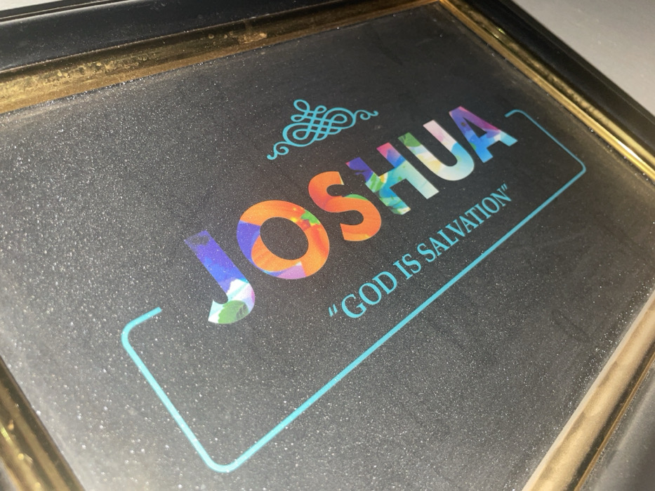 A framed image displays the name "JOSHUA" in colorful, patterned letters against a dark, speckled background