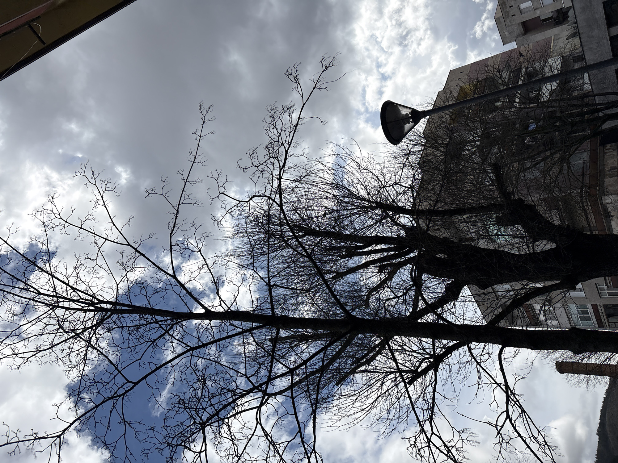 The scene depicts an urban environment within the city of Unknown, Unknown, viewed from a low angle looking upwards. The sky overhead presents mixed conditions: patches of clear blue sky with scattered white cumulus clouds are visible in the upper-left, transitioning to denser, grey overcast clouds that dominate the upper-right portion of the frame. Several deciduous trees, completely bare of leaves, are silhouetted prominently against the sky in the foreground and midground, showcasing their intricate branch structures. A tall, black, conical street lamp is positioned vertically in the mid-right, displaying multiple light sources within its fixture. In the background, partially obscured by the trees, stand multiple multistory buildings. On the left, a lighter-toned building with several windows and visible balconies is present. To its left, a slender, reddish-brown brick chimney rises above other structures. On the right, a larger, taller building with a mottled facade, exhibiting faded yellow/beige and reddish-brown tones, is visible, featuring numerous windows. A shorter, adjacent building is situated further to the right. No individuals or specific actions are discernible within the frame. The environment is characteristic of a built-up area with established urban vegetation, consistent with a leafless season.