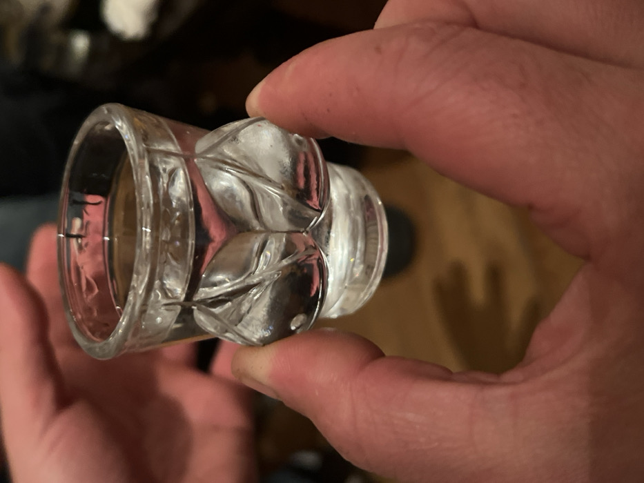 - "A clear glass shot glass, approximately two-thirds full with a translucent liquid, is held by two hands" by FM-QWs9h1, licensed under CC BY 4.0