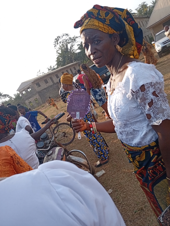 A woman with a patterned headscarf and a white lace top stands in a field. She is holding a fan with text on it. Several other people are visible in the background, along with a motorcycle and a building. The woman's attire suggests a cultural or traditional event.