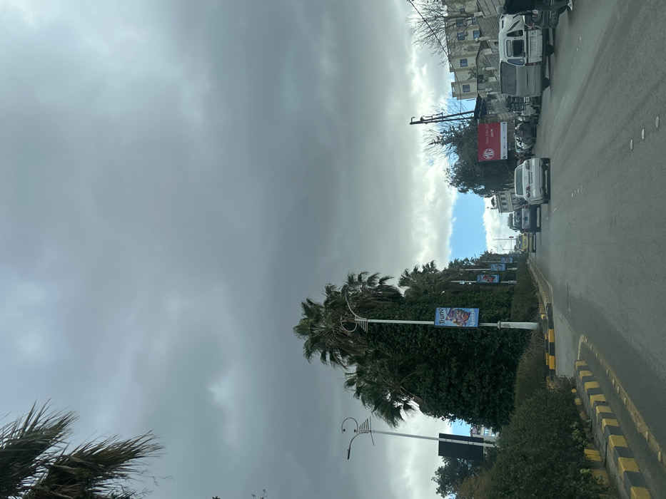 This image depicts a street scene in Al-Qanawat Municipality, Syria, under an overcast sky with patches of brighter blue visible towards the horizon