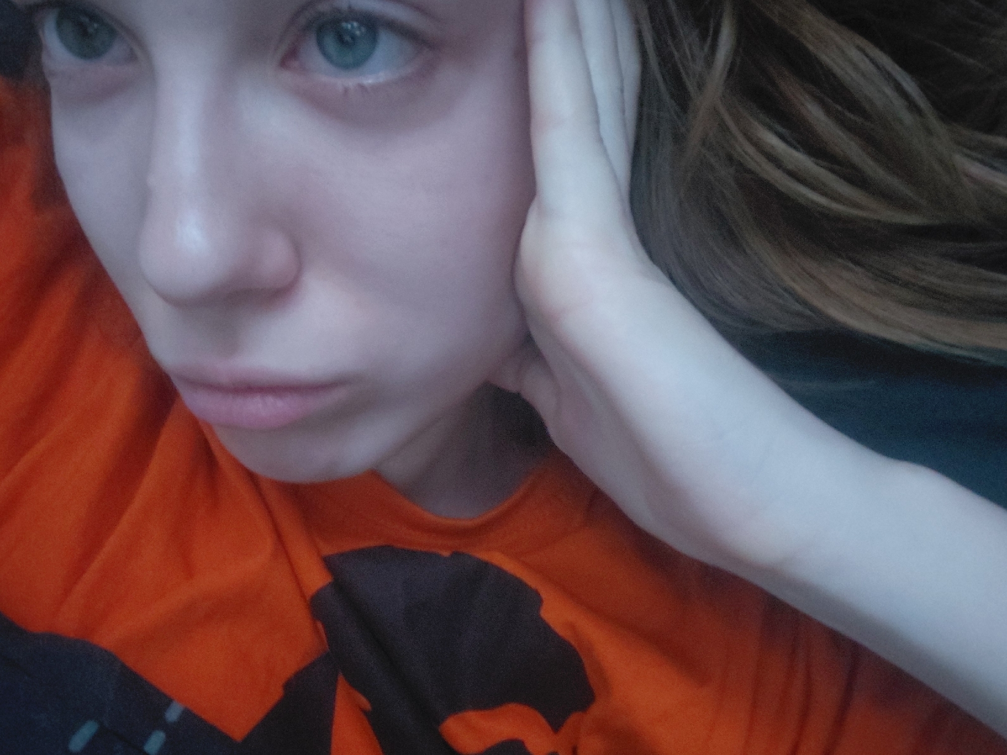 A close-up of a person's face and upper body. The person has fair skin, light-colored eyes (possibly blue or green), and brown hair visible on the right side of the image. The person is wearing an orange t-shirt with a dark-colored design on the front. Their left hand is positioned against their face. The location in the city of Kazanlak, Bulgaria is unknown.