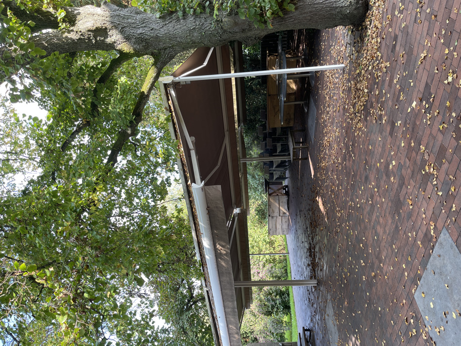 - "The image displays an unoccupied outdoor paved patio area in La Wantzenau, France, situated under a large, extended brown canvas awning supported by white metal poles" by FM-ji4kE2, licensed under CC BY 4.0
