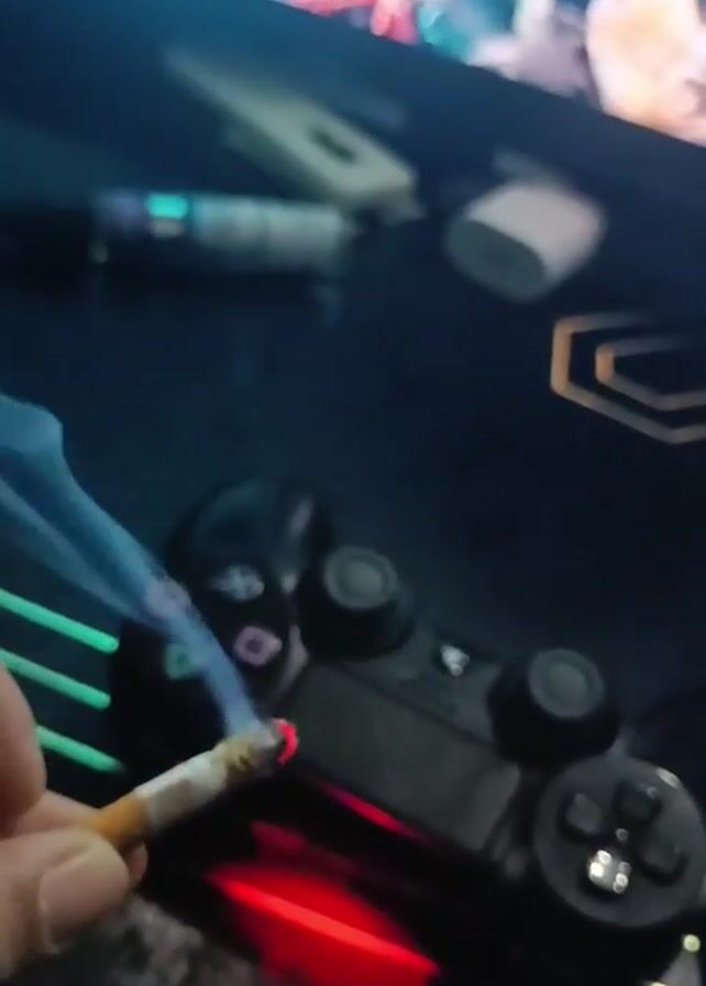 A hand holds a lit cigarette over a black PlayStation 4 controller