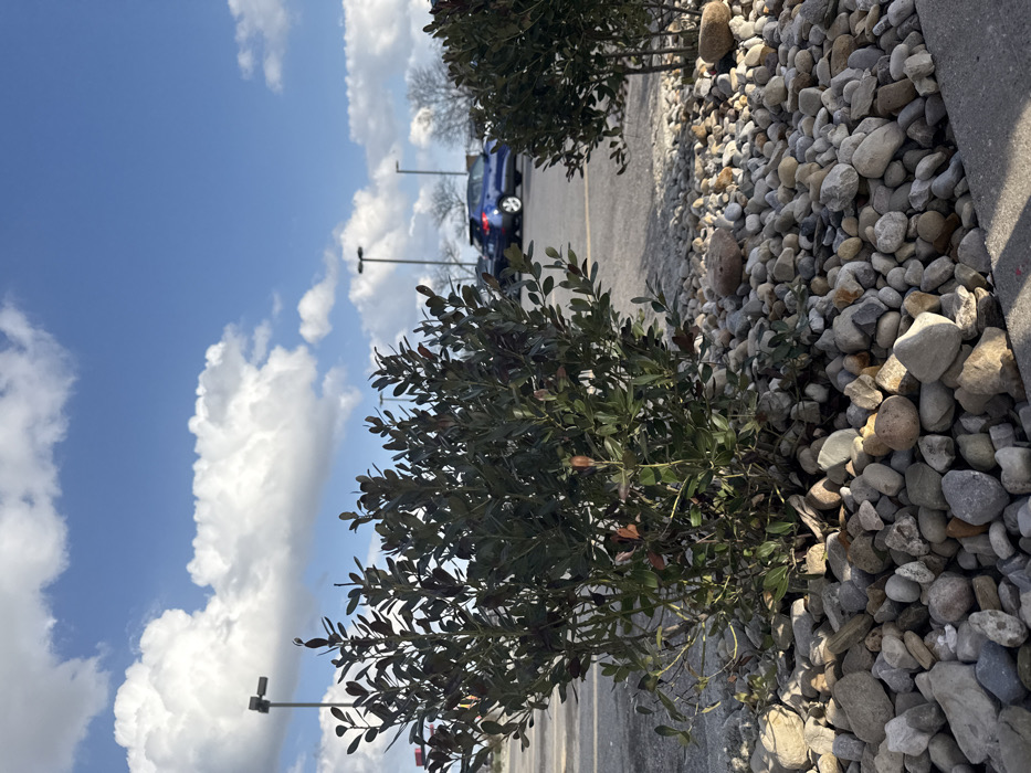 This image depicts an outdoor commercial landscape under a clear blue sky with scattered white cumulus clouds. In the foreground, a landscaped bed composed of various-sized river rocks and pebbles contains two dense shrubs with dark green and reddish-tinged leaves, possibly evergreens, with the prominent shrub being centrally located. A concrete curb is visible at the bottom right. In the midground, an asphalt parking lot is visible, showing faint white parking lines. Several vehicles are present; a dark blue SUV, appearing to be a Subaru Forester or similar model, is partially visible and parked or idling in the central-right background. Other indistinct vehicles are further in the distance. Tall, dark-colored light poles illuminate the parking area, and bare deciduous trees are visible against the horizon. No individuals are visible, and there are no discernible actions or interactions taking place. The environment suggests a typical commercial property, such as a large retail store, strip mall, or office complex parking lot. Without specific identifying signage, architectural features, or street markers, a precise street address within Columbus, Ohio, United States of America, cannot be determined from the visual evidence; however, the scene is consistent with common commercial areas found throughout the city.