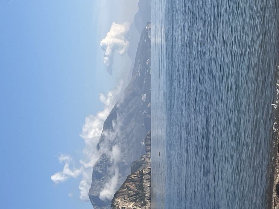 The image displays a coastal scene in Prijevor, Montenegro. The foreground reveals a narrow strip of pebbly shore where shallow, light blue-green water meets the land with minimal wave activity. The midground is dominated by a calm, blue-green sea with subtle ripples. A small, dark, elongated object is visible floating horizontally on the water's surface in the left-center. The background features a mountainous landscape under a clear, light blue sky with scattered white cumulus clouds. To the left, a rugged, steep cliff face with visible rock strata descends into the sea. Centered and extending to the right, a large, dark grey-green mountain range rises, partially obscured by white clouds clinging to its peaks and slopes. Further distant mountains appear fainter to the right. White structures, indicative of coastal buildings, are visible along the base of the mountains in the mid-background. No people are present.