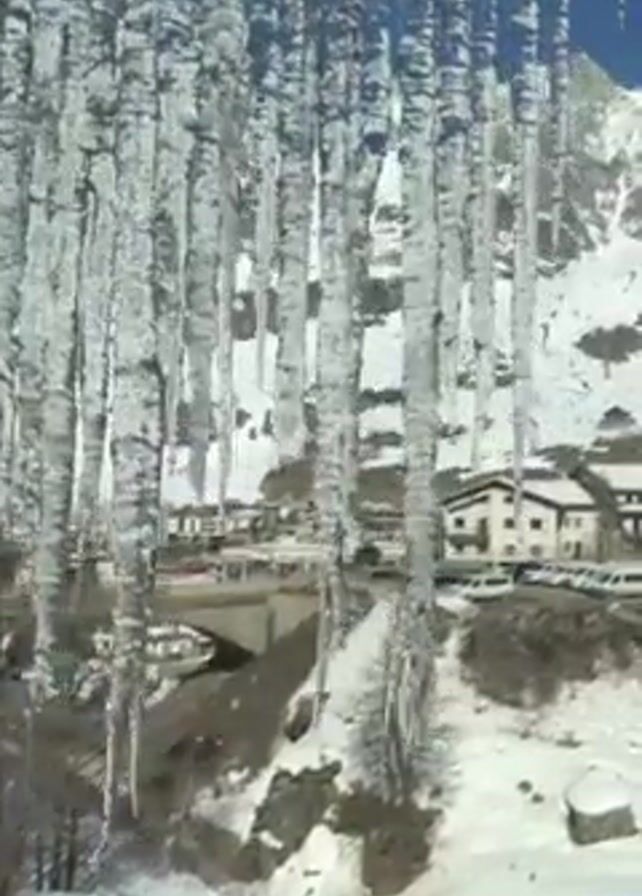 view from inside a building looking out at a snow-covered landscape. Large icicles hang from the top of the window, partially obscuring the view. Beyond the icicles, there is a small town with buildings and a road visible. Snow covers the ground, and there are snow-covered mountains in the background under a clear blue sky. There is background audio of an advertisement.