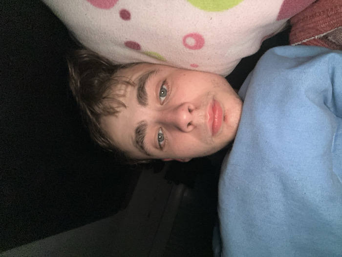 A close-up selfie captures a young man with light skin, striking blue eyes, and light brown hair. He is resting on a pillow with colorful circular patterns, partially covered by a light blue sweatshirt. The background is dark and indistinct, giving the image a low-light atmosphere. His expression is neutral, almost pensive, and the overall composition is simple and intimate.